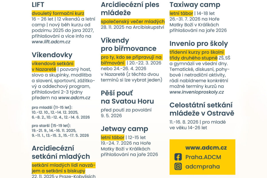 Dovolujeme si publikovat přehled termínů akcí a setkání, pořádaných ze strany Arcidiecézního centra mládeže. Můžete si jednotlivé termíny opsat z úvodní stránky webu centra mládeže, anebo si stáhnout plakátek – pokusili jsme se termíny přehledně shrnout.